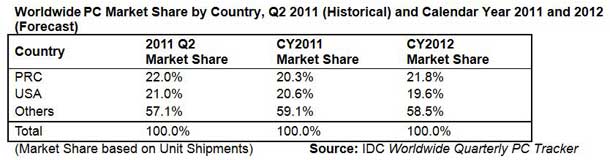 Its bottom-up methodology delivers an accurate view of the PC market and just revealed that the PC shipments in the China market have exceeded those of the United States in the second quarter of 2011 (2Q11). Approximately 18.5 million units worth US$11.9 billion shipped in China during the quarter, compared to 17.7 million units worth US$11.7 billion in the US, China represented 22% of the global PC market’s unit shipments compared to the US at 21%.