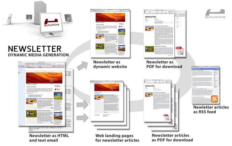 Web forms, for the acquisition of addresses, can be easily and intuitively designed on-screen and then adapted and integrated in newsletters or Web pages – with automatically created links to fields in the address database and pre-population of contents per mouse-click. Evalanche provides further templates that can be used to rapidly create professional newsletters without any programming skills. Users just have to add the texts, articles and images of their choice and the correct scaling and representation takes place automatically, as does individualization and personalization for precisely targeted one-to-one communication.