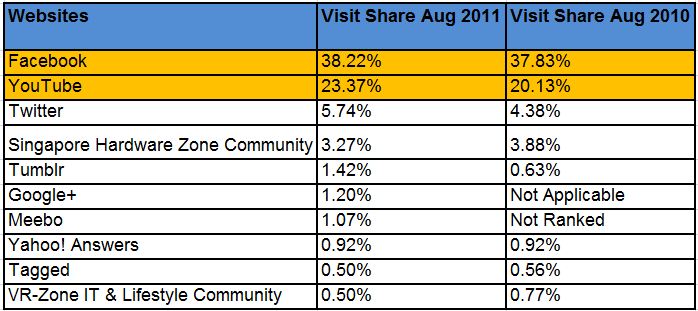 Singapore internet users also showed more interest in YouTube, evidenced by a 3.24% increase in share of visits between August 2010 and August 2011. This could represent YouTube being a potential competitor to Facebook for the local marketing dollar (Table 2).