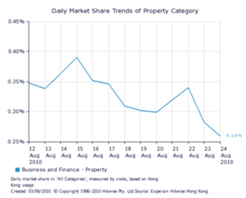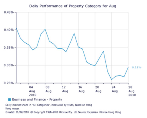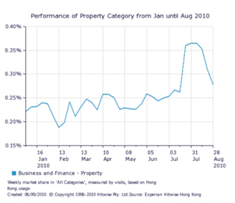 According to Experian Hitwise, a leading online competitive intelligence service, visits by Hong Kong Internet users to property related websites fell dramatically in the month of August, decreasing by 40 percent (see figure 1). Despite the fall in August, the traffic to property related websites has increased overall by 31.8 percent since January this year (see figure 2).