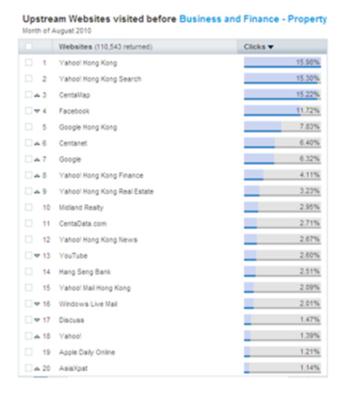 Search engines and portals remained the predominant navigation channel for Hong Kong Internet users to reach property related websites, with Yahoo! Hong Kong and Yahoo! Hong Kong Search accounting for 31.29 percent of referral traffic in August. Facebook was identified as the major social network representing 11.72 percent of upstream visits (see Figure 4).