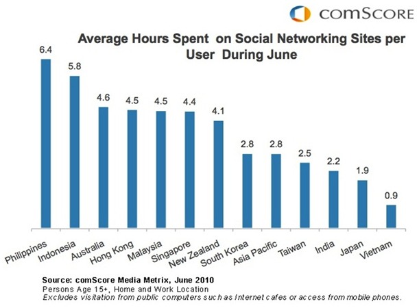 Internet users in the Asia-Pacific region averaged 2.5 hours on social networking sites and visited the category an average of 15 times. Across markets, the Philippines showed the highest penetration of social networking usage with more than 90 percent of its entire Web population visiting a social networking site during the month, followed by Australia (89.6 percent penetration) and Indonesia (88.6 percent penetration).