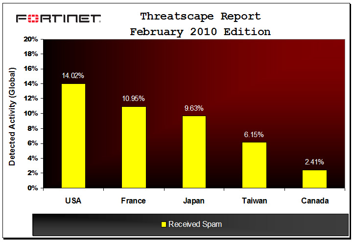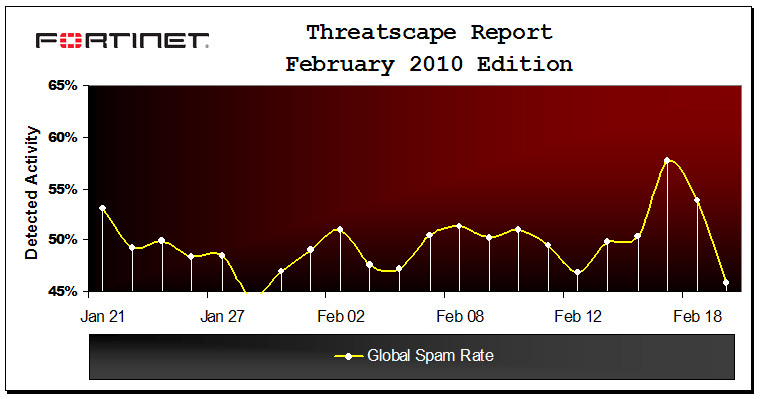 For those who think that spam is no longer a problem, think again, Fortinet’s February 2010 Threatscape report showed strong spam activity, with one particular campaign accounting for more than half of the total volume of malware detected this period.